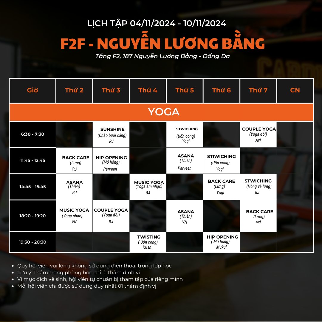 F2F gửi bạn lịch tập tuần mới (04/11-10/11/2024). Các lớp tập trải dài các khung giờ trong ngày, bạn có thể thoải mái lựa chọn tập luyện.