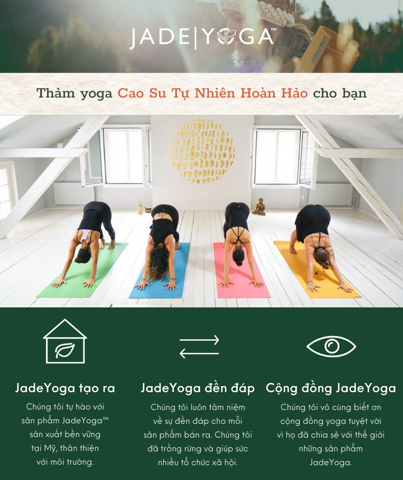 Cho đến nay, JadeYoga vẫn luôn là thương hiệu được tin tưởng trên toàn thế giới, không chỉ do chất lượng cao cấp (all grip, no slip) mà còn do những đóng góp có ý thức với môi trường của họ. Khám phá JadeYoga như khám phá một món quà đẹp, đẹp từ tâm người gói đến bao bì bên ngoài và món quà bên trong. Với phương châm Thân thiện môi trường (eco-friendly), tất cả sản phẩm thảm của JadeYoga đều được sản xuất từ cao su thiên nhiên vốn là nguồn tài nguyên có thể tái hồi phục, không hoá chất độc hại. Nhà máy sản xuất của Jade đặt tại Mỹ nhằm đảm bảo việc tuân thủ cao nhất đối với các quy định về môi trường của Mỹ và điều kiện làm việc tốt nhất cho các công nhân. Chiến dịch “Mua một tấm thảm, trồng một cây xanh” (“Buy a mat, plant a tree”) là cách tri ân đối với mẹ Trái đất, nơi cung cấp nguồn nguyên liệu cho các sản phẩm thảm của họ.