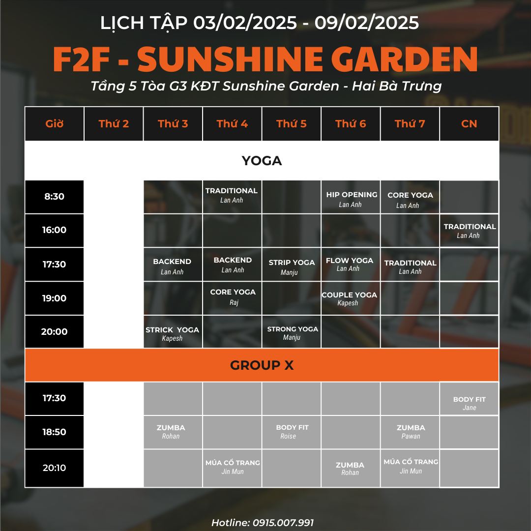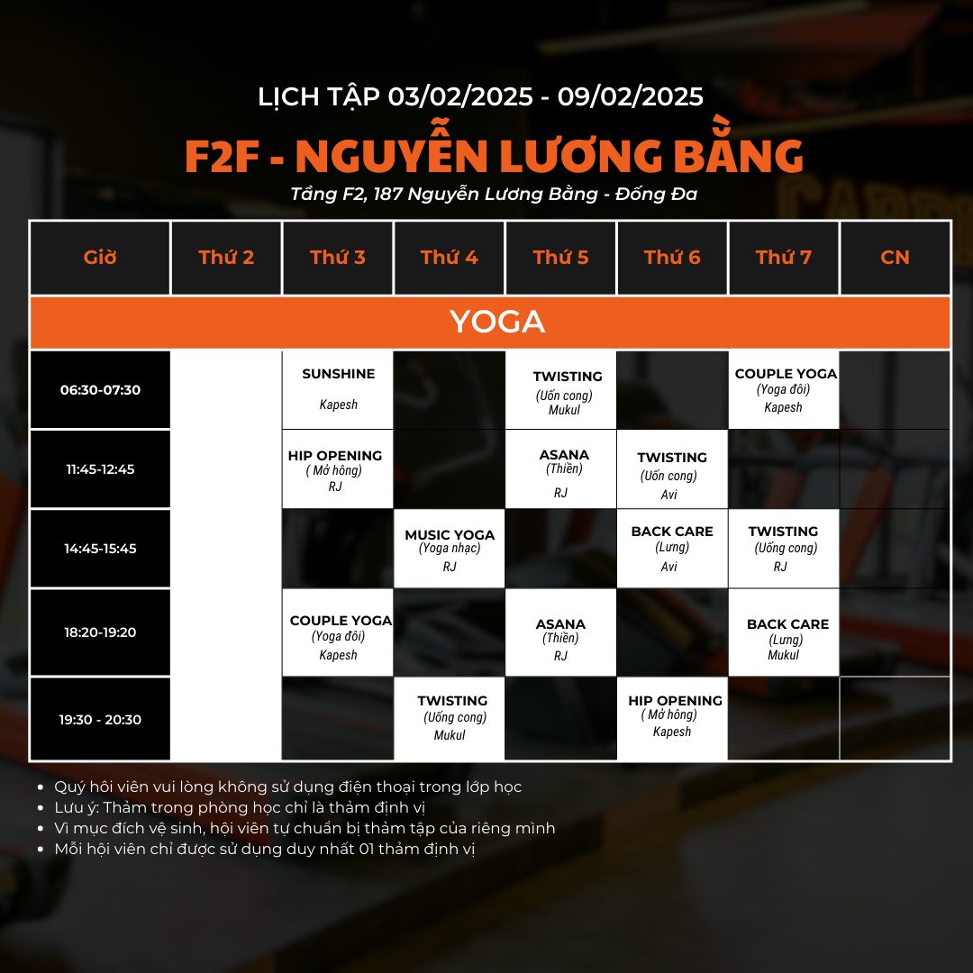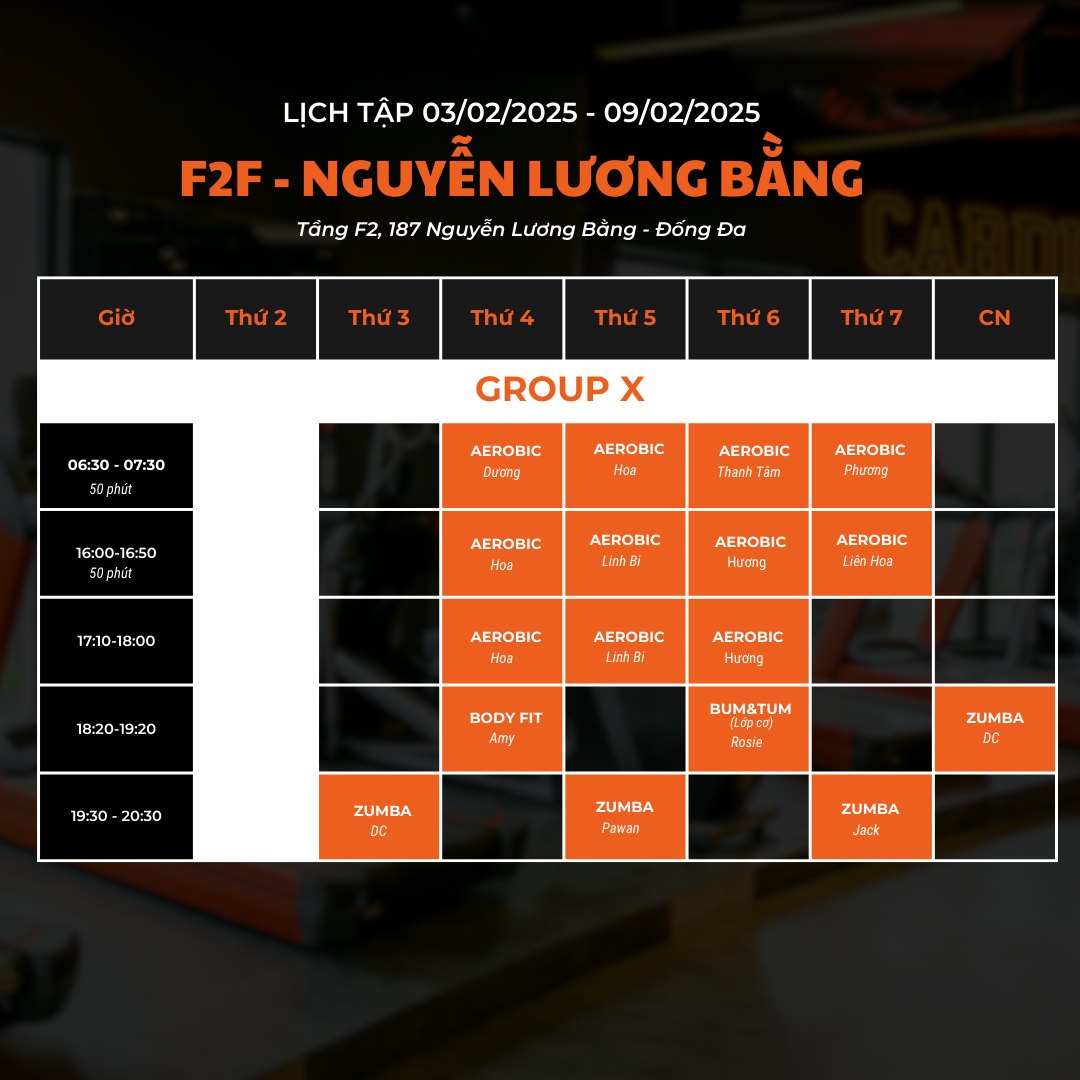 F2F gửi bạn lịch tập các lớp Group X và Yoga (03/02/2025 – 09/02/2025). Bạn nhớ dành thời gian và tham gia cùng chúng tôi.
