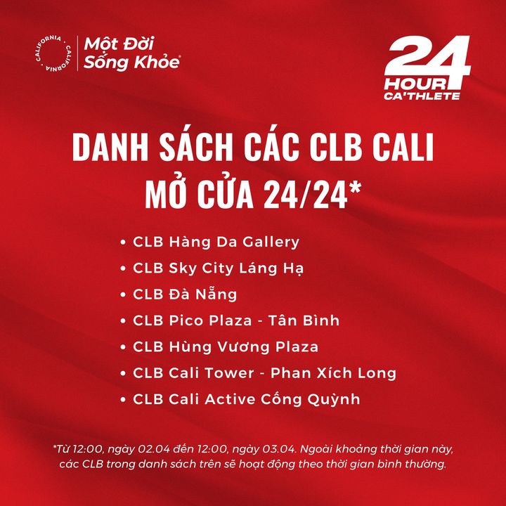 Như một lời cổ vũ đặc biệt và để cho mọi người có thêm thời gian tham gia Thử thách 𝟮𝟰-𝗛𝗼𝘂𝗿 𝗖𝗔’𝘁𝗵𝗹𝗲𝘁𝗲, Cali sẽ mở cửa 7 CLB hoạt động xuyên đêm (từ 22:00 ngày 02.04 đến 06:00 ngày 03.04), sẵn sàng chào đón các chân chạy đam mê vận động.